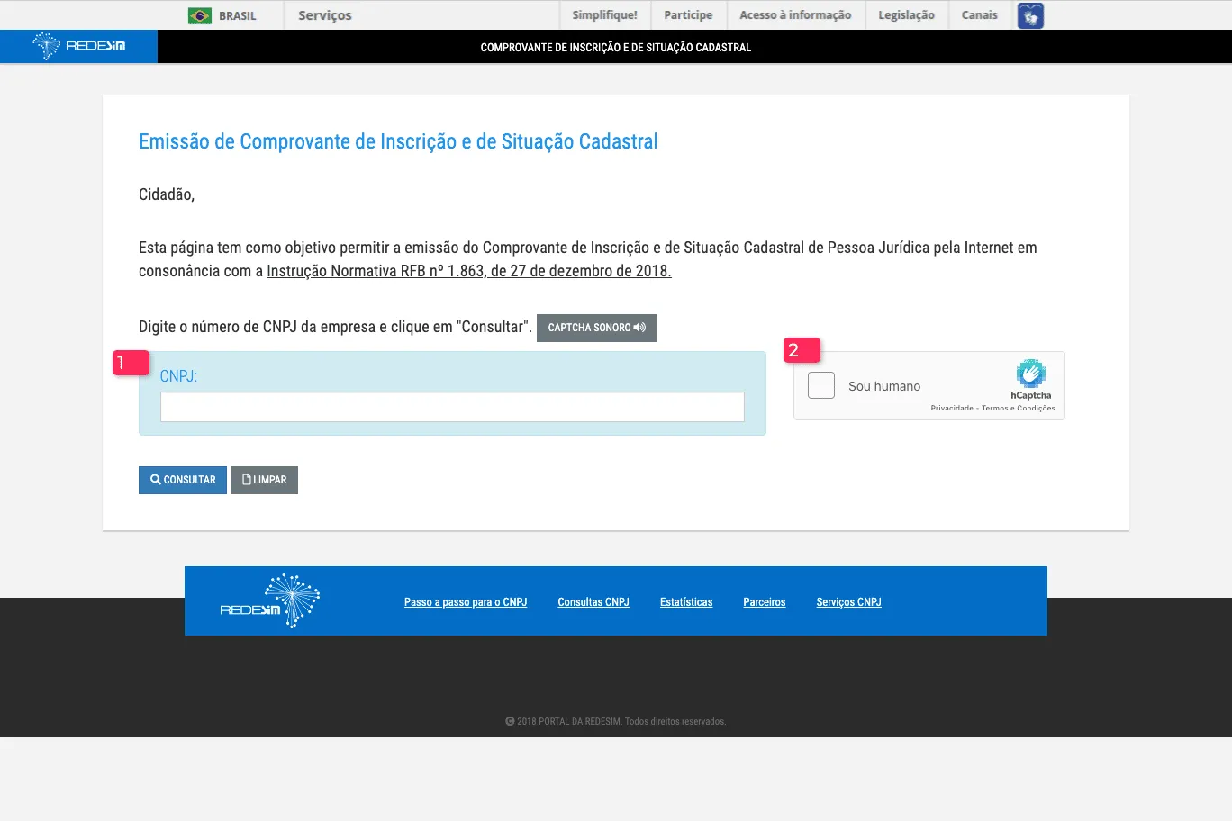 Abra o site da Receita Federal na página de consulta a situação cadastral, digite o CNPJ no campo (1) e depois, clique no quadrado (2) que diz “Sou Humano” para verificar que você não é um robô.